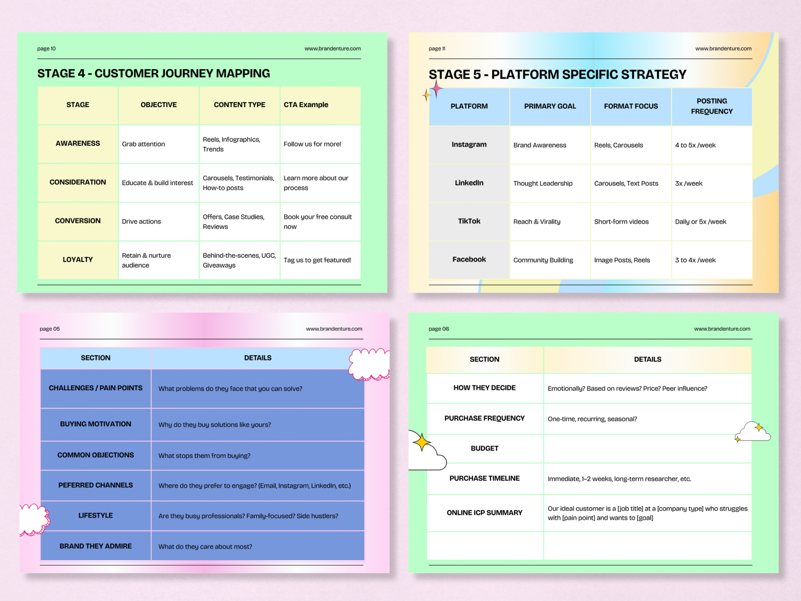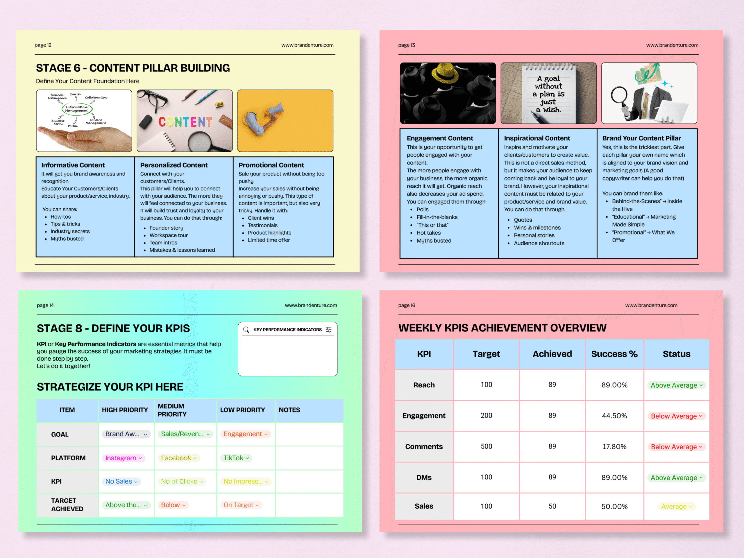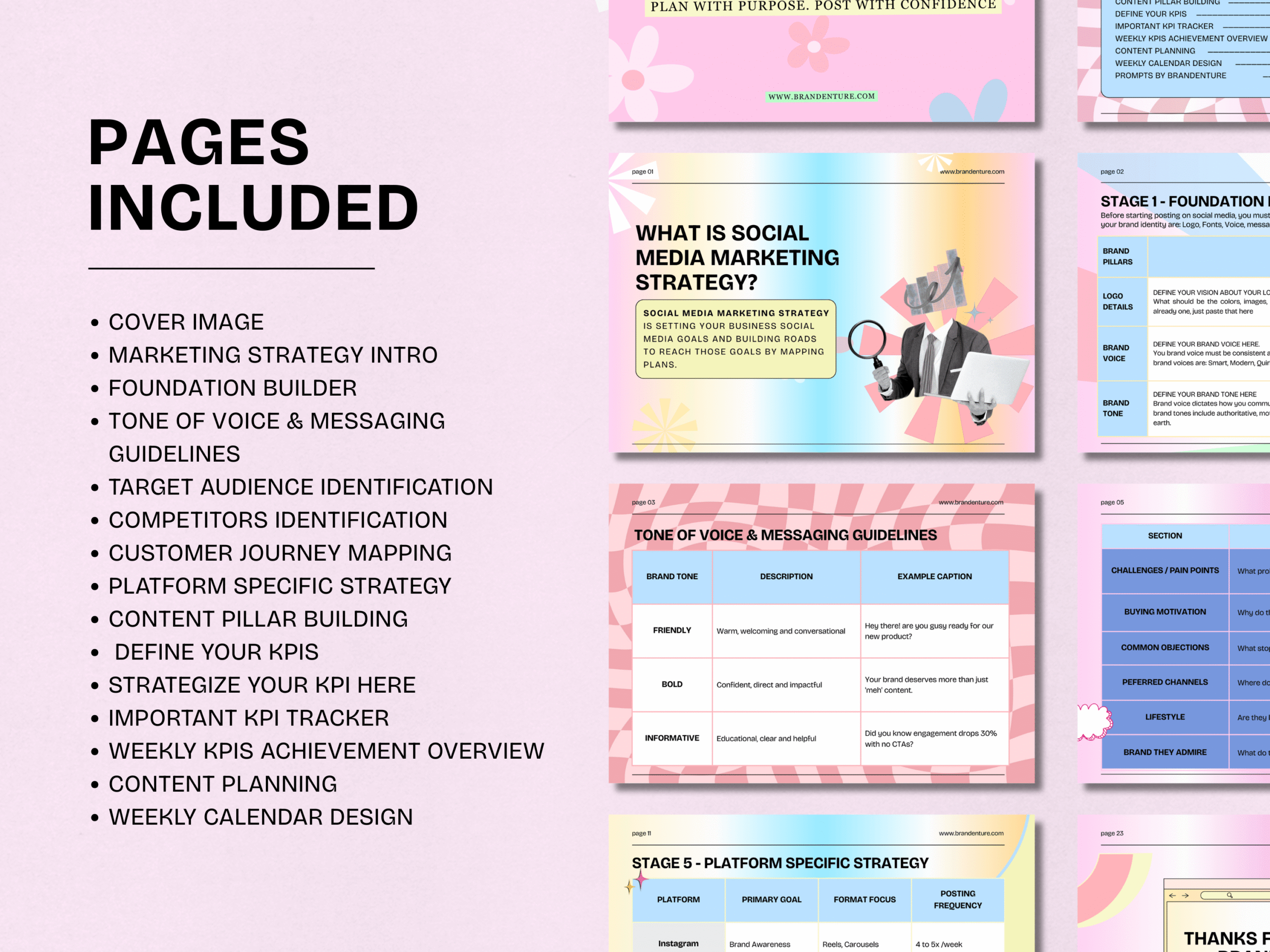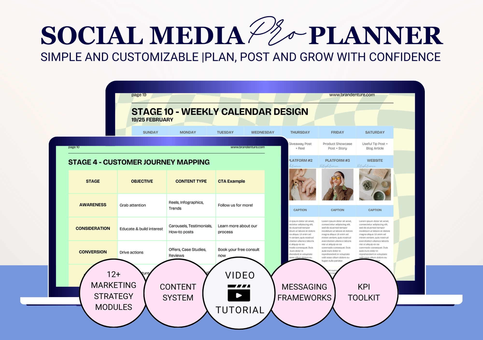 The Brandenture Social Media Planner and Content Calendar gives you:
