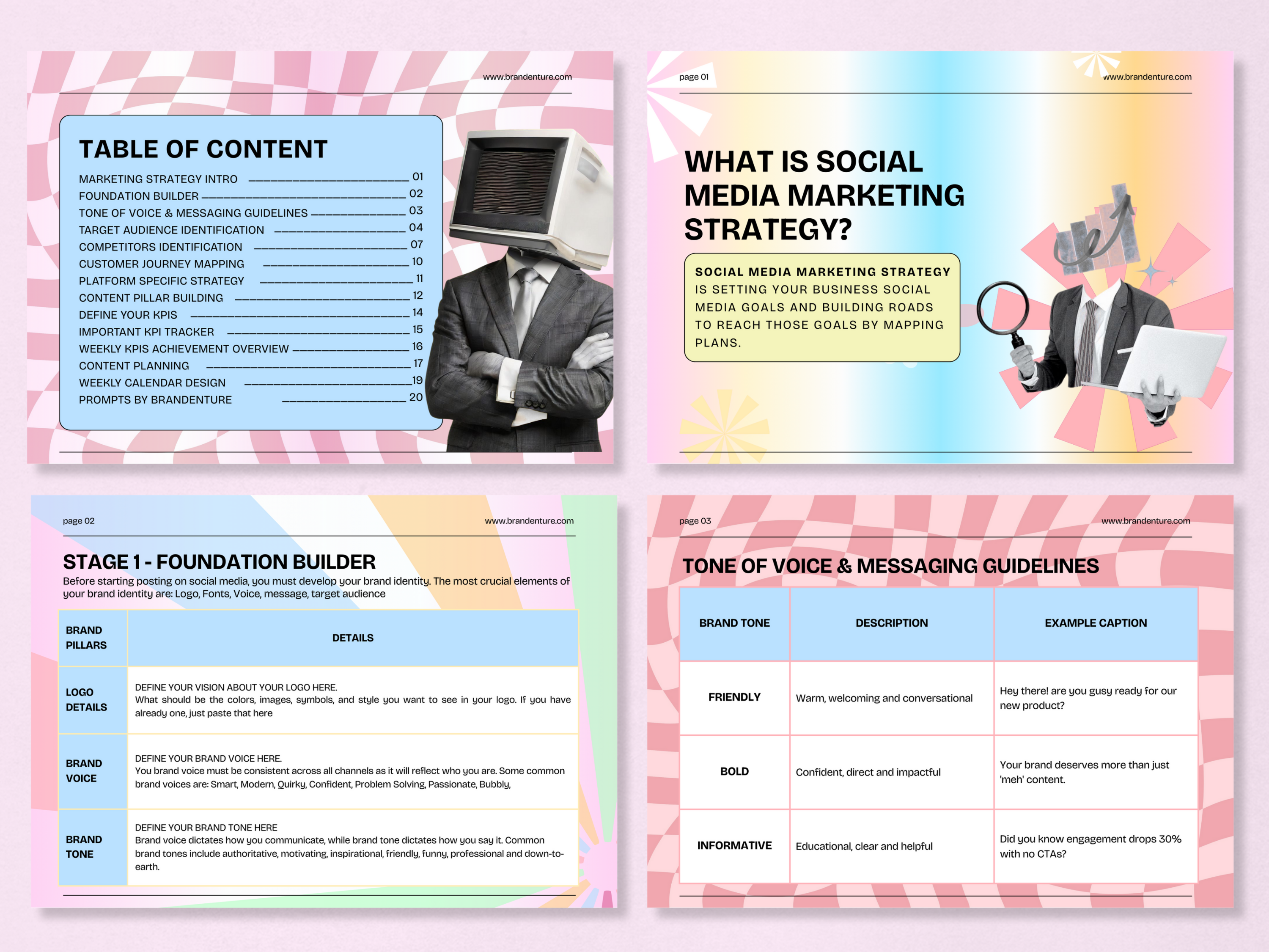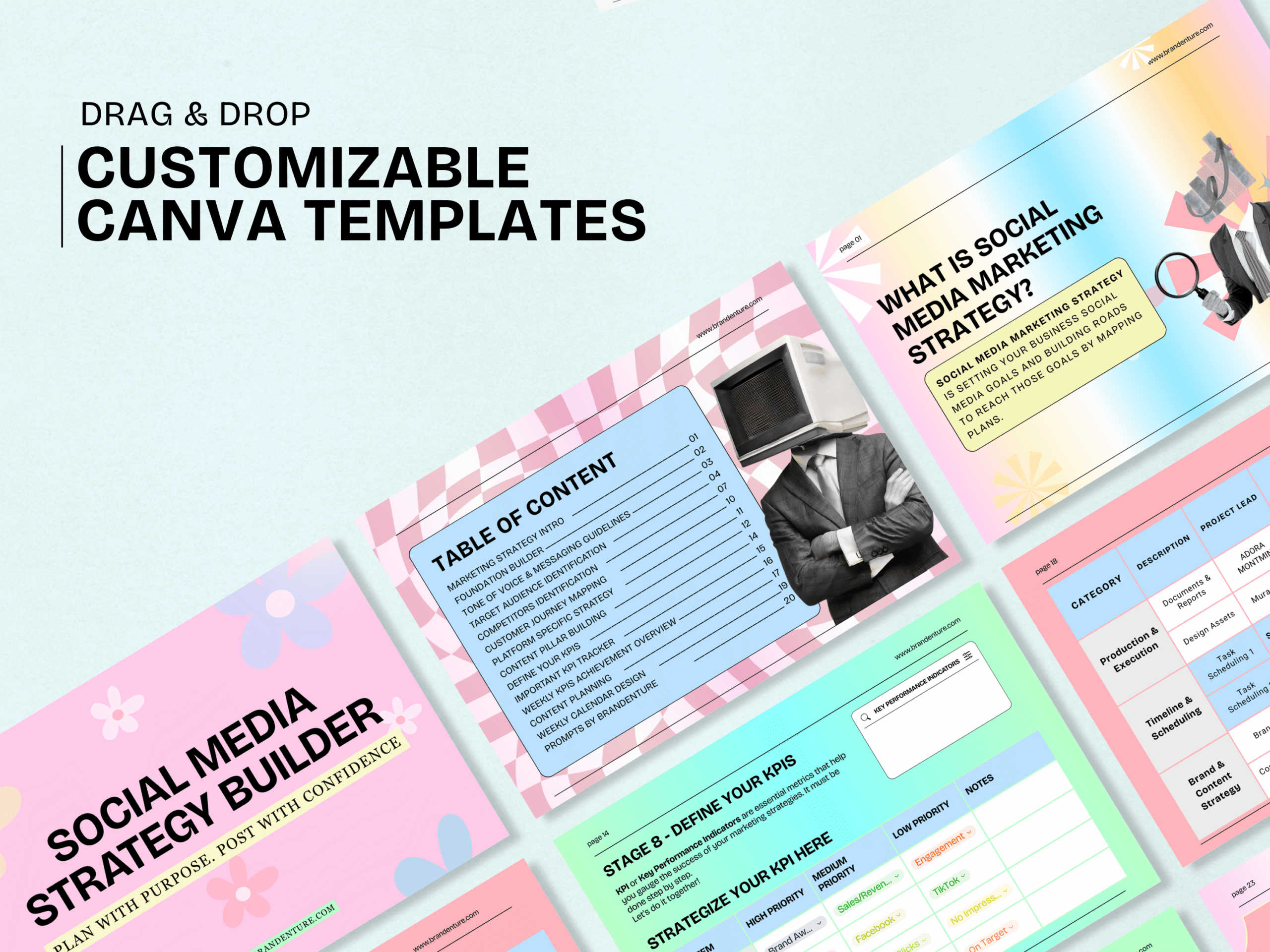 26 pages to design your social media strategy professionally through editable Canva slides/templates